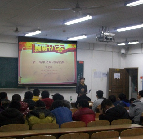 首先,吕亚洲带领大家重温了十八大报告的主要内容。随后,郑宇老师发表了重要讲话,他重申了十八大精神的重要性,希望大家深入了解党的十八大精神,希望大家发扬矿资101班团结向上的精神,用实际行动来贯彻党的十八大精神,迎接即将到来的期末考试,严肃考风考纪 。