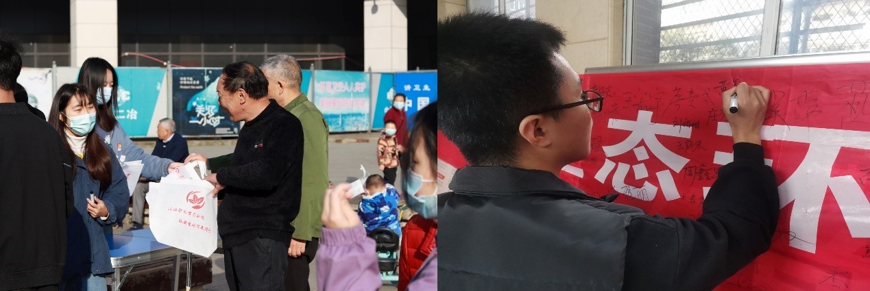 同学们从去年发生的澳大利亚山火、西班牙大暴雪、菲律宾火山喷发等自然灾害出发,结合当下的全球新冠疫情爆发,提到了人与自然和谐共生的理念,介绍了近些来年国家在生态环境保护方法制定的主要制度和法律法规的修订过程,鼓励公众举报环境违法行为,践行公民十条助力衡阳文明建设。在宣讲过程中,同学们积极为大家答疑解惑,还邀请大家在“法治护航生态环境,低碳生活你我同行”的横幅上签字,并为他们发放环保袋以减少塑料袋的使用,为保护环境助力。
