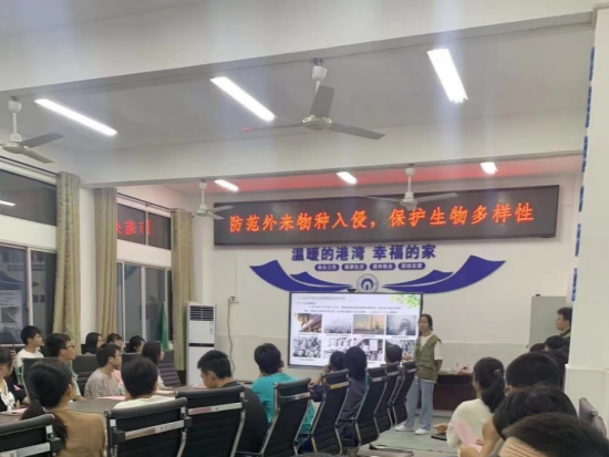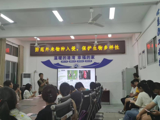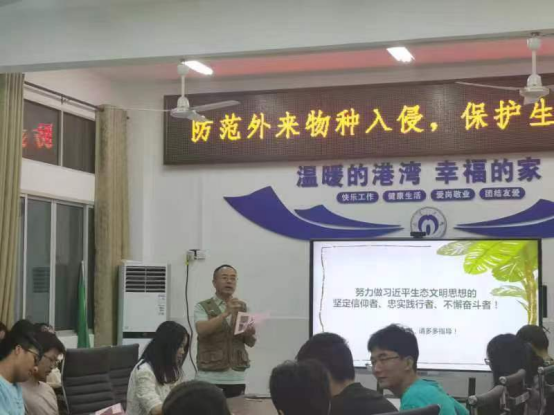 9月7日晚上,资环安公司的张晓文老师、唐东山老师带领湖南省绿色卫士衡阳绿雁大队和公司环保协会的志愿者们在公司的多媒体会议室进行了主题宣讲,听众为大一大二员工和其他环保爱好者60余人。宣讲内容主要包括:一、 习近平生态文明思想与实践;二、 中华人民共和国生物安全法;三、防范外来物种入侵;四、保护生物多样性。宣讲之后,大家就“两山”理论以及当前关注的“鳄雀鳝”、“一枝黄花”等热点外来物种进行了热烈的提问、讨论等互动活动。