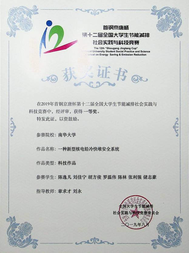 陈逸凡第十二届(2019)全国老员工节能减排社会实践与科技竞赛一等奖
