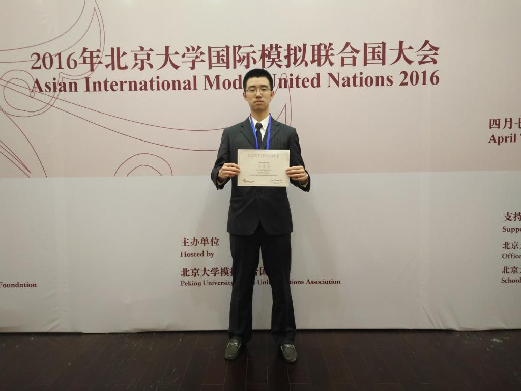 公司纪富豪同学荣获2016年北京大学国际模拟联合国最佳代表称号