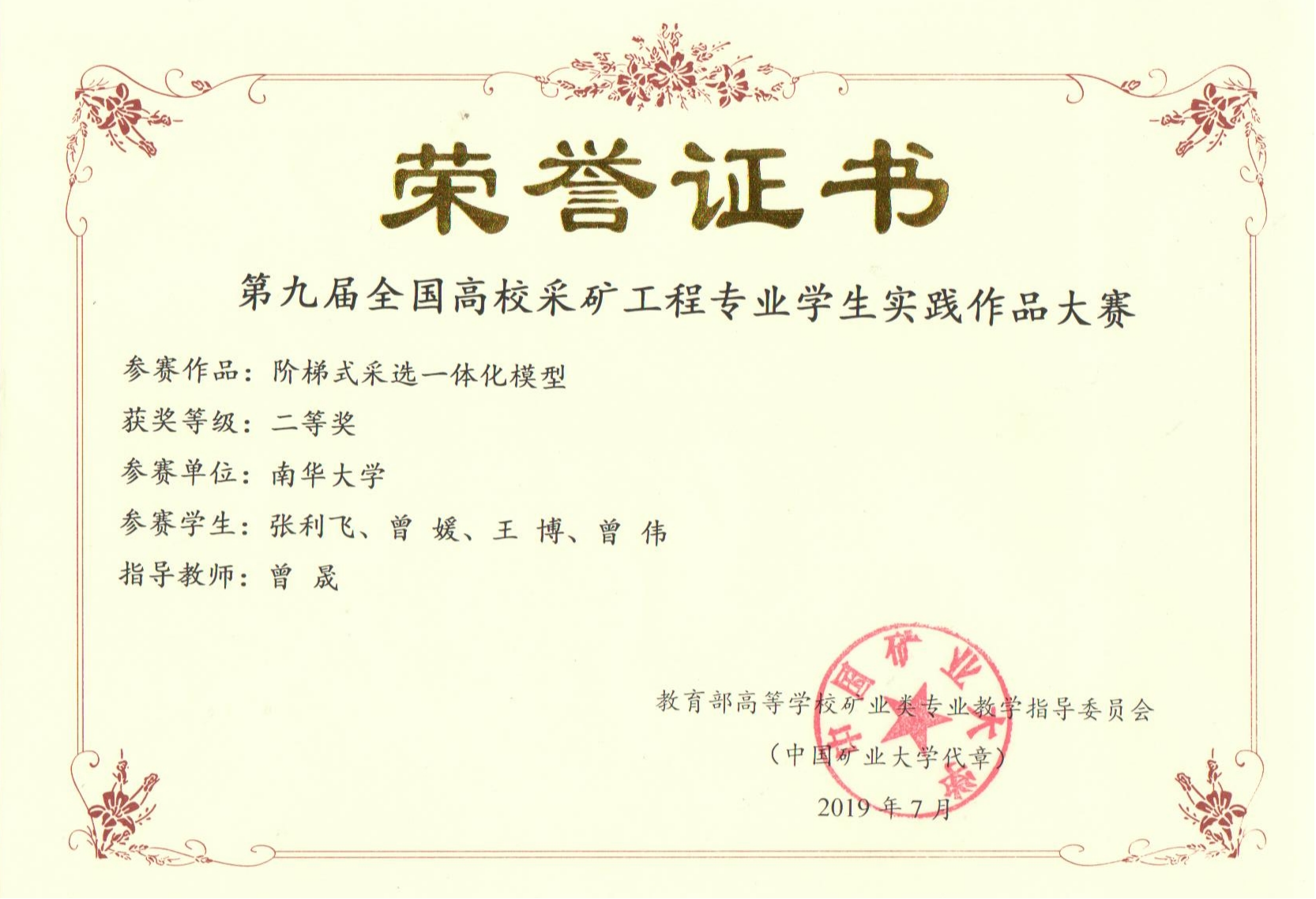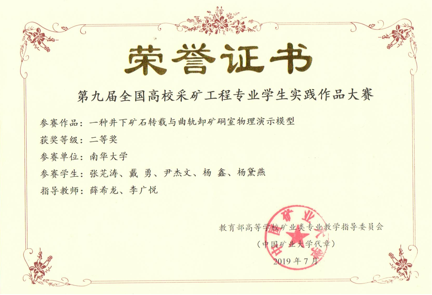 第九届全国高校采矿工程专业员工实践作品二等奖(张利飞 曾晟)