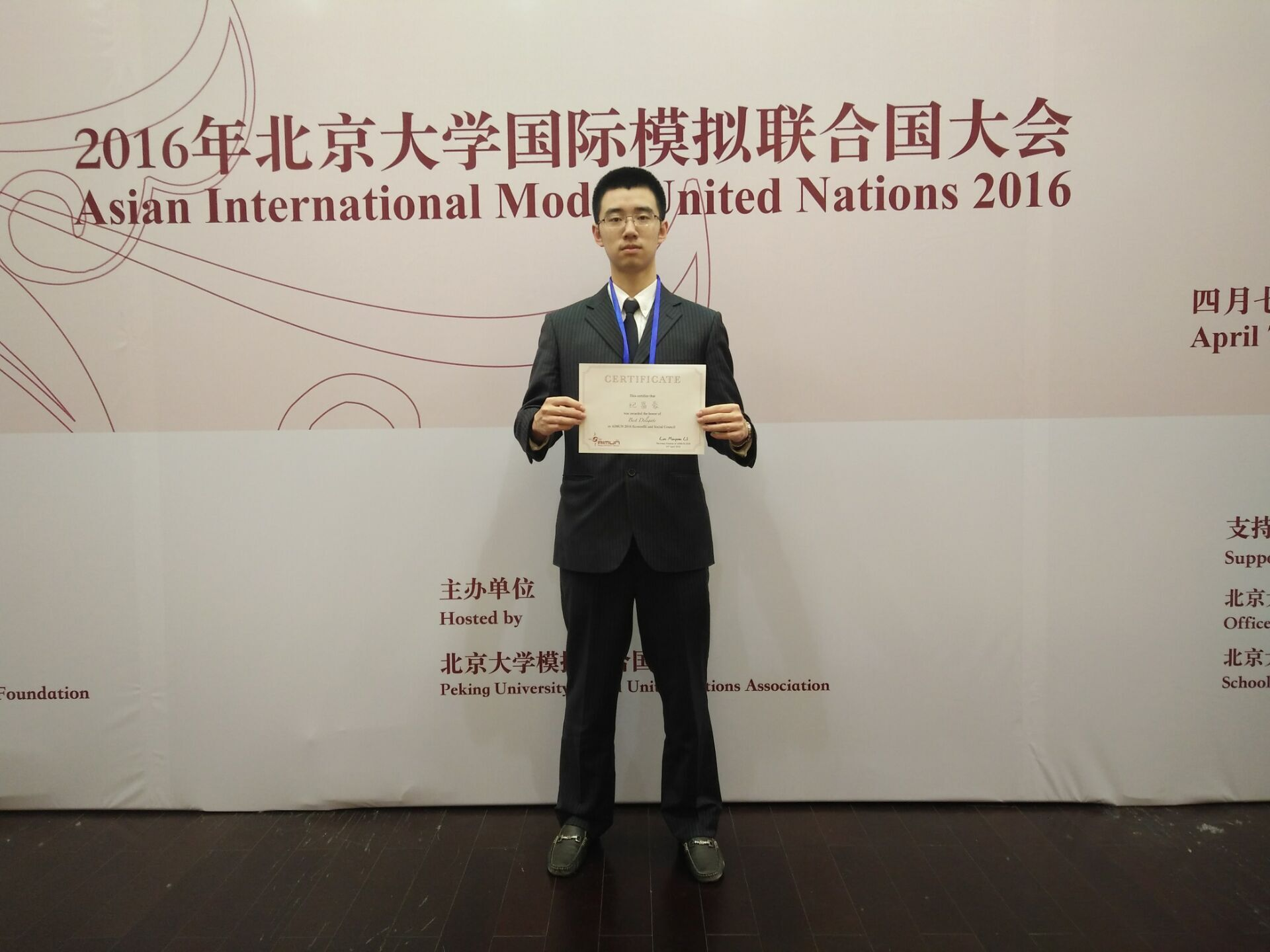 纪富豪同学荣获2016年北京大学国际模拟联合国最佳代表称号