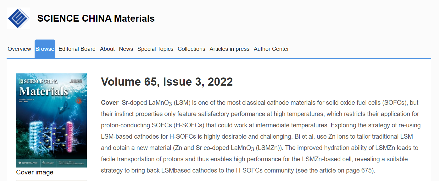 近期,公司毕磊教授团队研究发现,通过Zn元素的掺杂使得第一代Sr-LaMnO3阴极可以在质子导体固体氧化物燃料电池中展现出优异的性能,相关成果发表在2022年3月刊的《中国科学材料》(SCIENCE CHINA Materials)期刊上,以期刊封面论文的形式发表题为“High-performance proton-conducting solid oxide fuel cells using the first-generation Sr-doped LaMnO3cathode tailored with Zn ions”的研究论文,并被《中国科学材料》期刊的官方微信公众号进行推送宣传。这是该团队在质子导体固体氧化物燃料电池材料研究中取得的又一成果。