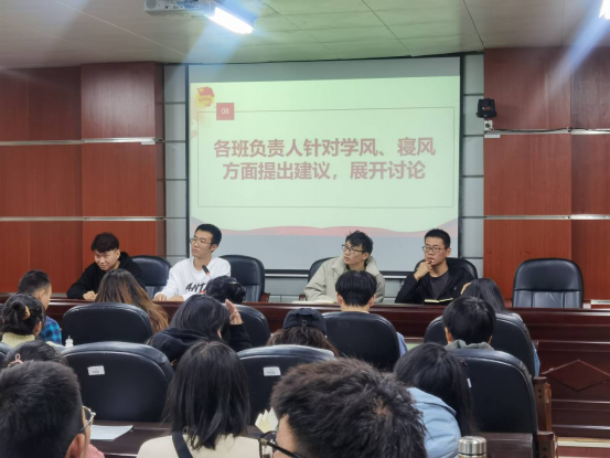 公司师生非常注重学风、寝风的建设,大会第五项追加了就学风、寝风建设相关工作进行了讨论。首先院主席团成员魏宇航同学针对宿管部考核改革、近期工作内容进行了简单概括,随后院宿管部部长王城同学就近期工作及下一阶段工作进行了安排,两位同学的讲话强调了宿管部会针对员工的实际情况进行考核并每周进行各项考核的数据统计。接着院学习部部长郑鑫杨同学对近期学风建设工作进行了安排,提到早晚自习、正常上课的缺勤迟到现象,并提出若有同学缺勤四次及以上,给予公司警告,如缺勤达到8次及以上,将进行全院通报批评的方案。最后各班负责人配合展开讨论,主要围绕“夜不归宿”、“自习或开班会无可用教室”、“违章电器具体分类”、“因特殊原因上课违纪”这几个问题提出疑问,最终问题得到解决,进一步明确了违章电器的类别,并将针对夜不归宿的现象进行严查,当自习无教室可用时联系郑鑫杨同学会帮忙解决。