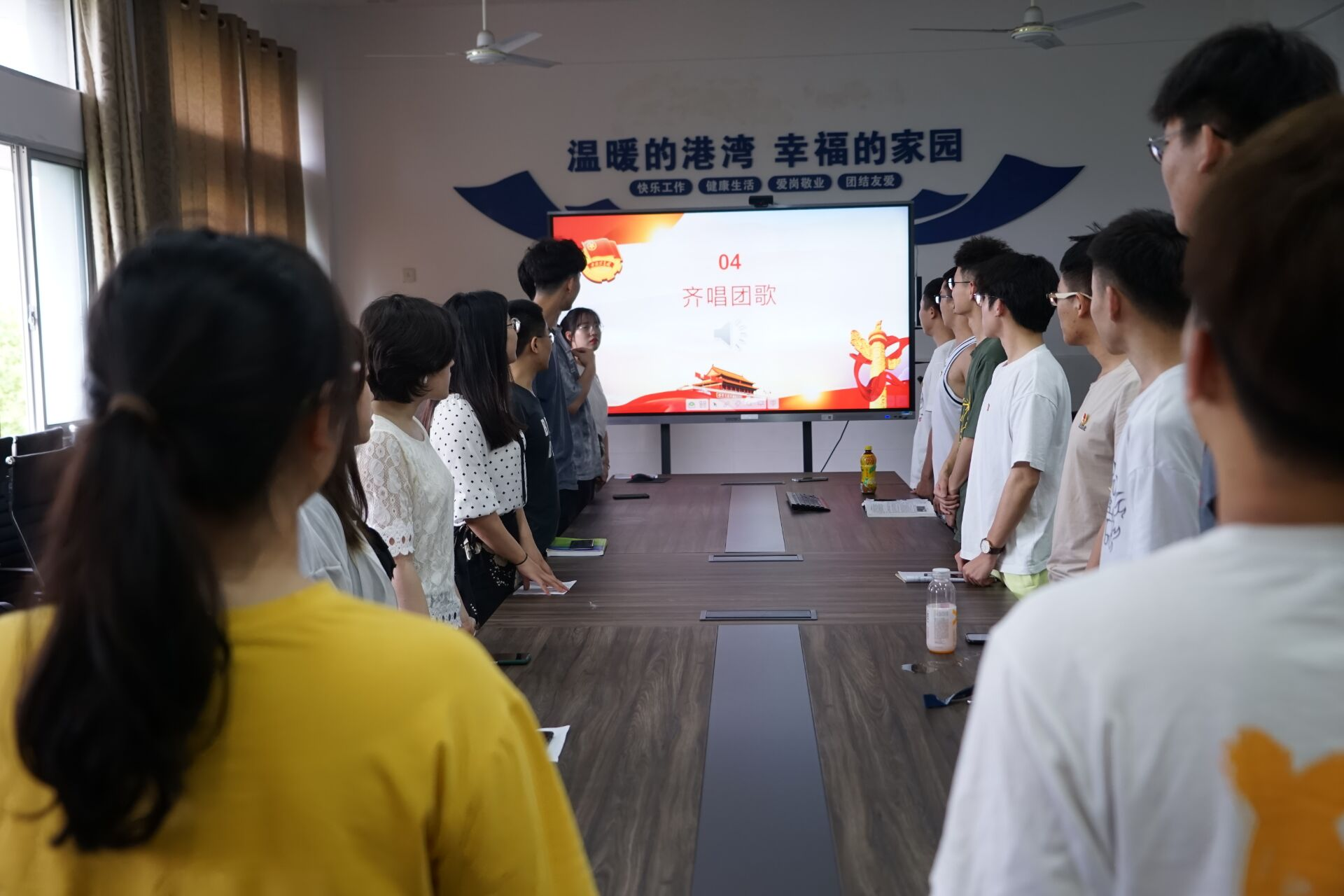 最后,由魏翠悦同学主持全体与会人员重温入团誓词并齐唱团歌,会场庄严肃立,在朝气蓬勃的歌声中结束了这一场有深刻教育意义的主题团会。