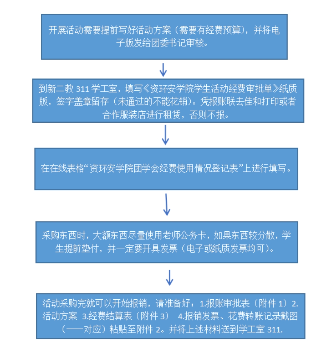 第十条 每次活动必须设活动负责人(一般由员工担任)一名,指导老师(主要负责活动财务相关事宜,原则上应为公司正式在岗职工)一名,不能由一人兼任。开展员工活动须事前向学工室提交活动申请及经费预算,填写《资环安公司员工活动经费审批单》(以下简称《申请表》),申请流程如下: