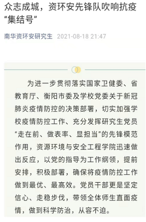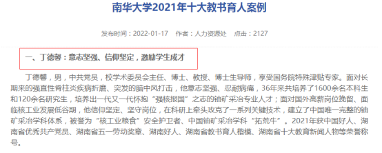 (4)厚植家国情怀,传承南华精神,深入推进文化育人。将核工业、铀矿冶精神融入公司产品各环节,定期举办先进事迹报告会,大力创作爱国主义题材的校园文化作品,引领师生在爱国报国文化的浸润中厚植家国情怀,勇担时代责任;依托校史馆、图书馆等,持续开展南华精神教育,加大对优秀员工、优秀科研工作者的宣传,以鲜活案例诠释南华精神,尤其是以学科带头人丁德馨教授的典型模范为学习对象,引导广大师生勤勉务实、甘于奉献。