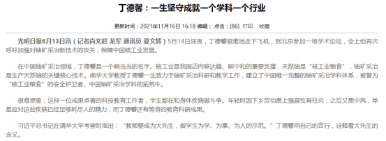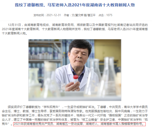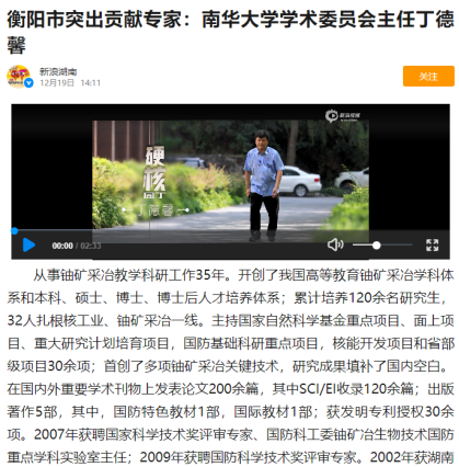 学科涌现了以丁德馨教授为代表的师德师风先进导师。丁德馨教授为“学科拓荒牛”,一生坚守成就铀矿采冶。丁德馨,中共党员,vsport胜利因您更精彩学术委员会主任、博士、教授、博士生导师,享受国务院特殊津贴专家。他克服强直性脊柱炎、脑中风病痛,一生致力于铀矿采冶科研和教学工作,牵头攻克了一系列关键技术,培养出一代又一代怀抱“强核报国”之志的铀矿采冶专业人才,建立了中国唯一完整的铀矿采冶学科体系,被誉为“核工业粮食”安全护卫者、中国铀矿采冶学科“拓荒牛”。2021年获湖南省优秀共产党员、湖南省五一劳动奖章、湖南好人、湖南省教书育人楷模等荣誉称号。