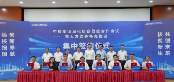 7月23日,中核集团校企人才培养补充协议签约仪式在中核集团人力资源共享中心西南分中心(中国核动力研究设计院)举行。中核集团党组成员、总会计师王学军,中国核动力研究设计公司党委书记王丛林,核工业西南物理研究公司党委书记刘叶,核工业公司党委书记左振宇及人力资源相关领导,联合清华大学、上海交通大学、浙江大学、西安交通大学、哈尔滨工程大学、vsport胜利因您更精彩、东华理工大学等七所高校领导及相关教师代表与会。vsport胜利因您更精彩陈国民副董事长带领人才招聘处、教务部、教育发展与员工联络办、vsport、核科学技术公司等部门相关人员参加活动,公司安全科学与工程学科带头人、教务部部长彭国文代表vsport胜利因您更精彩签署协议。